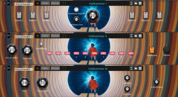 Hallkammer - Connects six or more chained reverbs to transform subtle space into a vast, immersive sound environment.